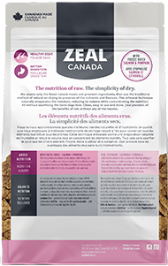 This recipe features freeze-dried wild BC salmon with Omega 3-6 to support healthy coat, skin and joints. Freeze-died pumpkin aids digestion with fibre and beta-carotene, which metabolizes into Vitamin A, also good for skin and coat. Freeze-drying locks in the nutrition, boosts flavour and adds a satisfying crunch to this recipe. Dogs love it.